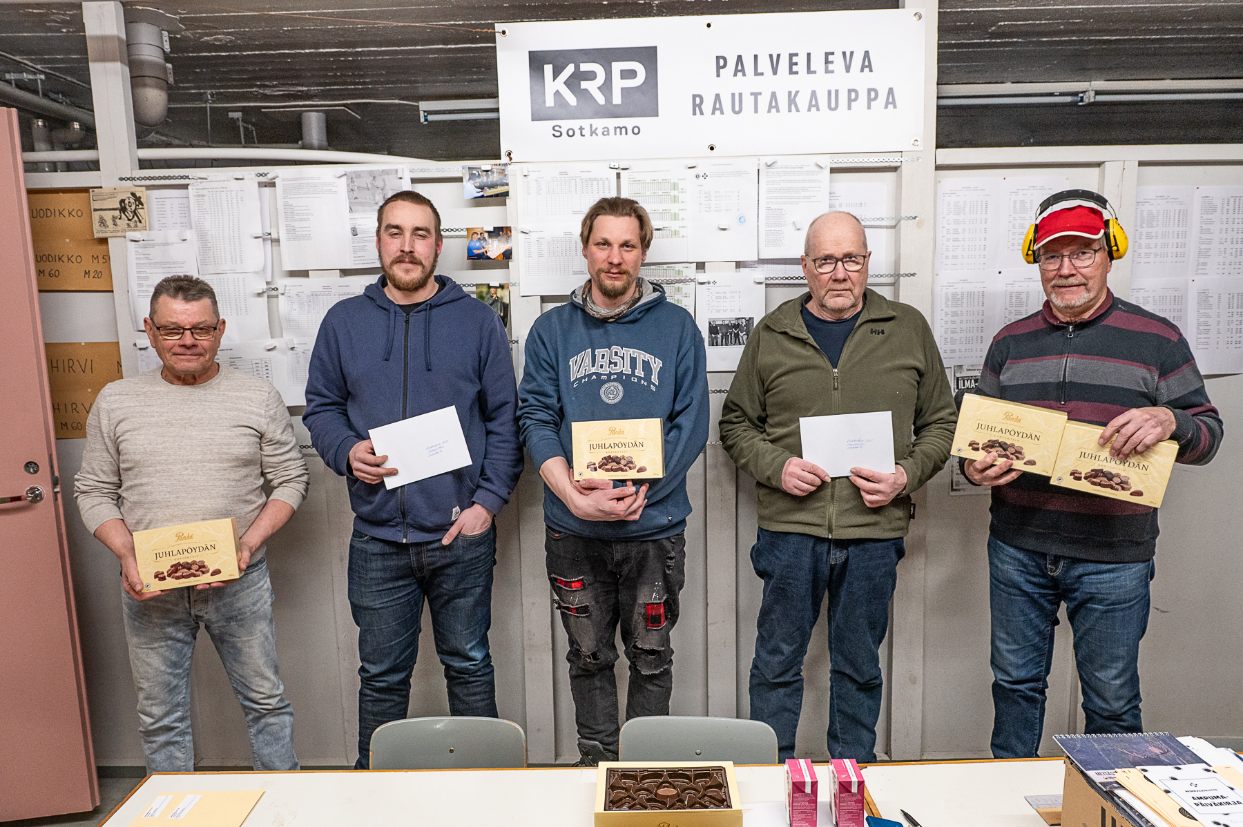 Sotkamon Reserviläisten kinkkukisa päättyi 16. joulukuuta. Viiden osakilpailun kolme parasta tulosta ratkaisi paremmuuden. Ilmapistoolisarjan voitti Lasse Kynäkoski ja ilmakiväärisarjan Arto Tolonen. Kuvassa Jouko Seppänen (vas.), Lasse Kynäkoski, Jyrki Anttonen, Arto Tolonen ja Reijo Huotari.