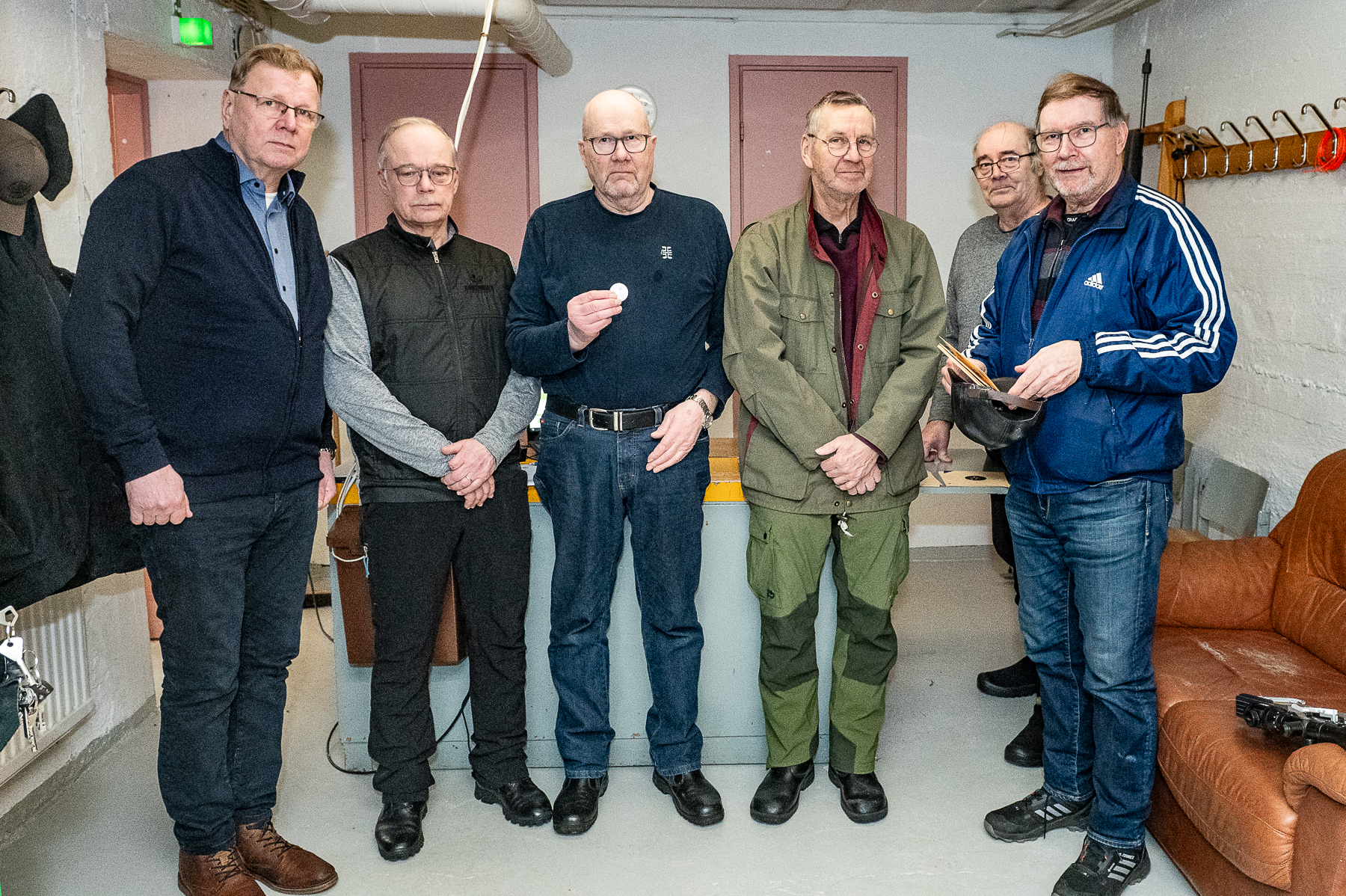 Ilmakiväärisarjan palkinnot on jaettu. Kuvassa tuomari Pertti Schroderus (vas.), kilpailun johtaja Ilkka Määttä sekä ampujat Arvo Tolonen, Markku Piipponen ja Reijo Huotari. Takaa kurkistaa tuomaristoon kuulunut Aulis Jurvansuu.