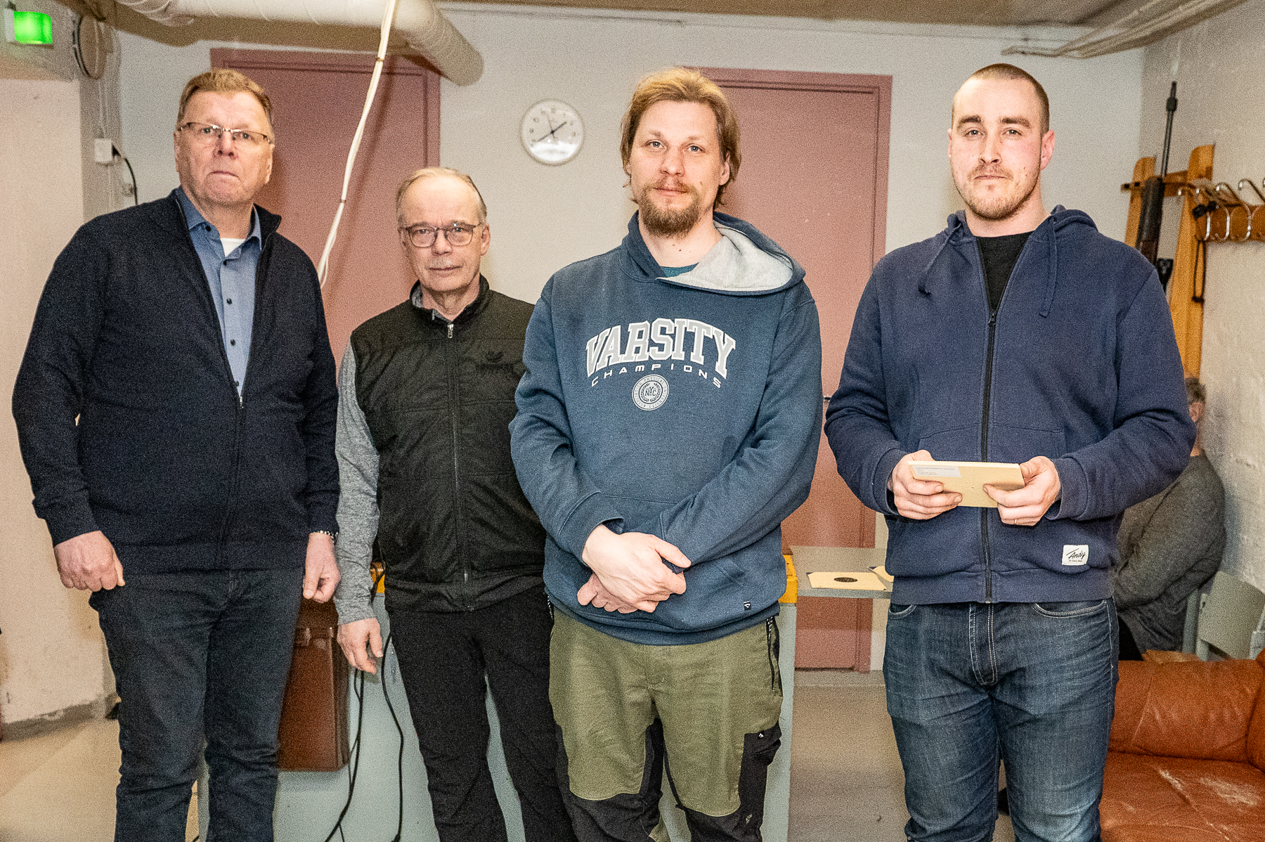Ilmapistoolin yleisen sarjan palkitut, voittaja Jyrki Anttonen (toinen oik.) ja Lasse Kynäkoski sekä tuomari Pertti Schroderus (vas.) ja kilpailun johtaja Ilkka Määttä yhteiskuvassa.