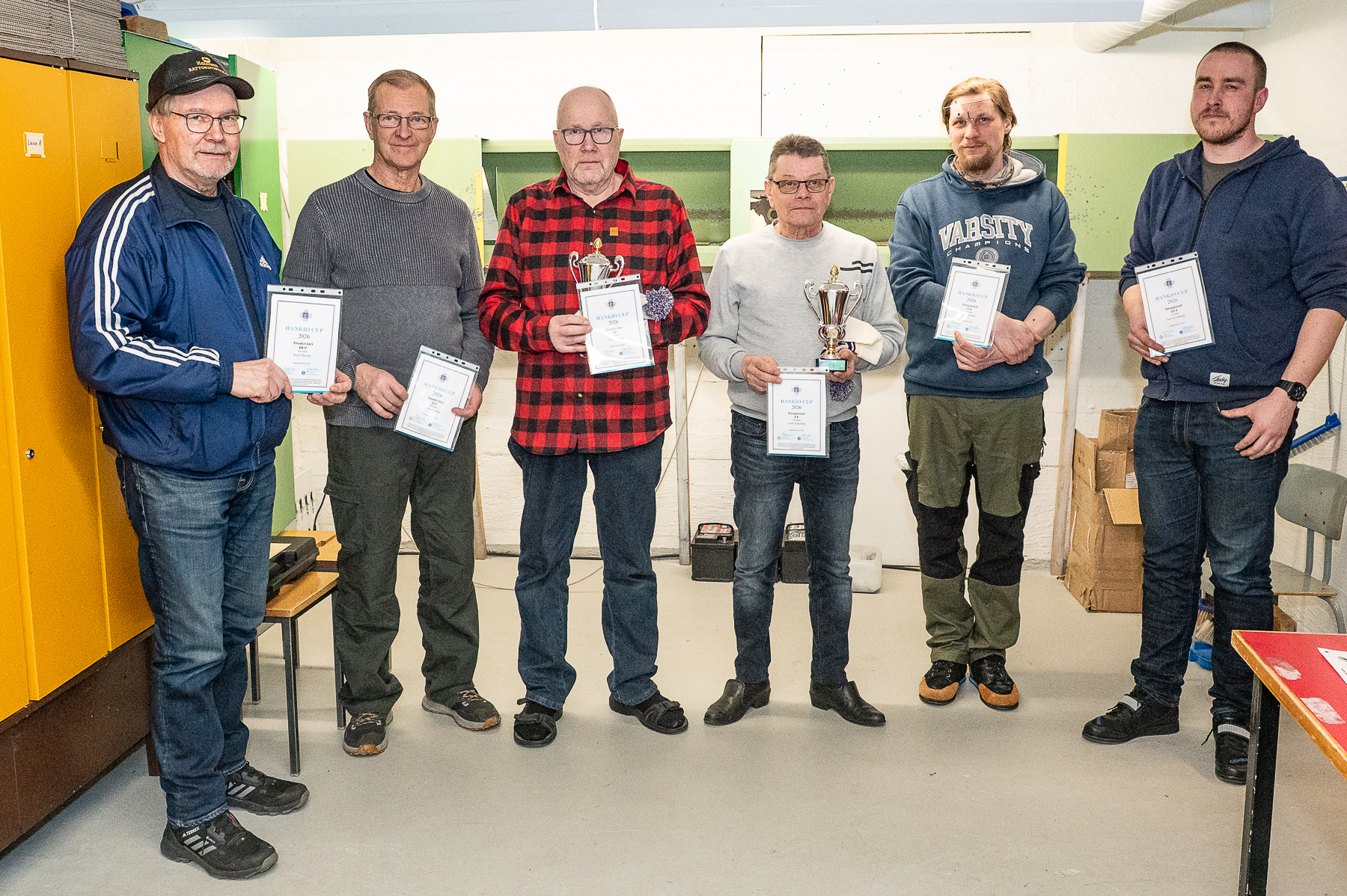 Vuoden 2026 ilma-aseiden Hankio Cupin palkitseminen tapahtui tiistaina 24. maaliskuuta Salmelan ilma-aseradalla. Kuvassa palkitut Reijo Huotari (vas.), Raimo Joensuu, Arvo Tolonen, Jouko Seppänen, Jyrki Anttonen ja Lasse Kynäkoski.
