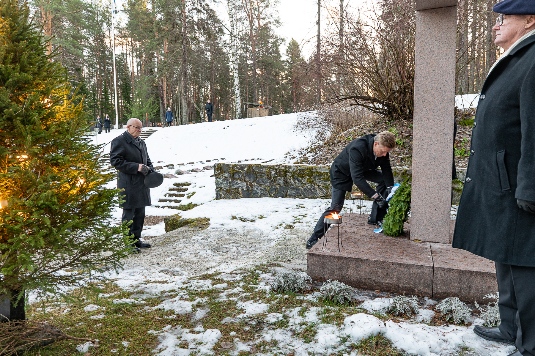 Jani Komulainen laskemassa seppelettä sankarihautausmaan sankariristille 30. marraskuuta 2025.
